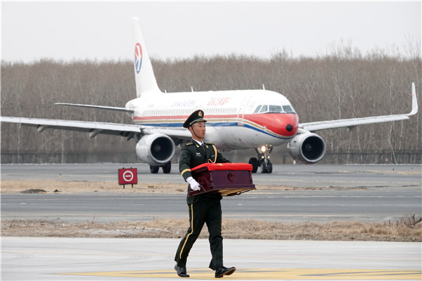 3月28日,在沈阳桃仙机场,礼兵手捧志愿军烈士遗骸棺椁走出专机。新华社记者李刚 摄