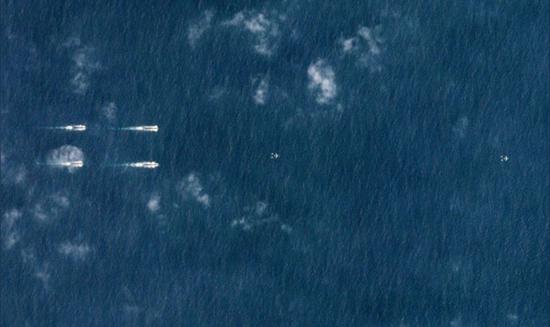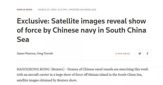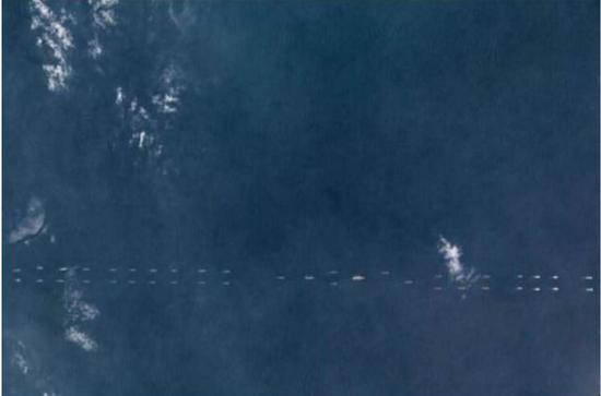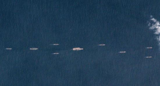 3月26日,路透社展示了美国遥感卫星数据公司星球实验室(Planet Labs)的两幅卫星照片,从中可见,至少有40艘军舰和潜艇分列在辽宁号航母前后,队列前方可能由潜艇领队,空中还有军机编队飞行。