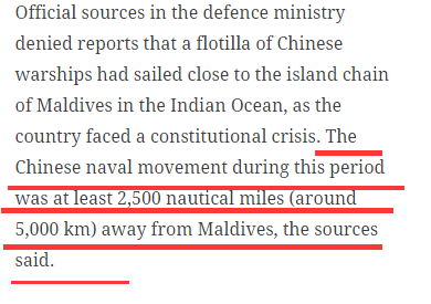 当时,印度国防部还特别给出数据说,中国海军距离马尔代夫的最近距离,也有2500海里(即约5000公里)之多呢。