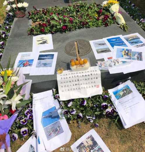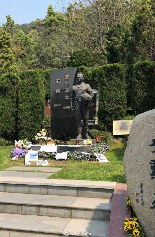 4月1日,网友@八卦小龙猫 拍摄的杭州“海空卫士”王伟烈士墓碑,很多人拿着鲜花自发前往悼念。