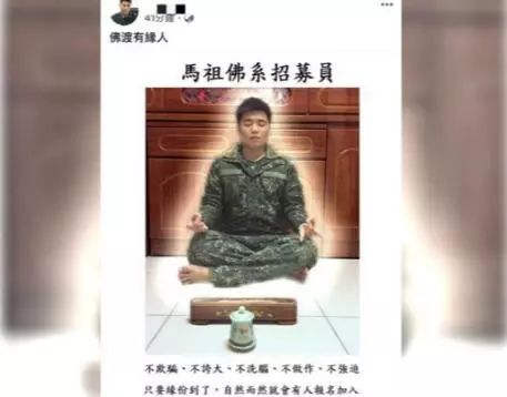 早前有报道指出,台军将招募压力下放到基层连队,针对“招募800名役期为1年的军官”计划,有连队在招募文宣中竟打出了“美女牌”,甚至还请出了“佛祖”。