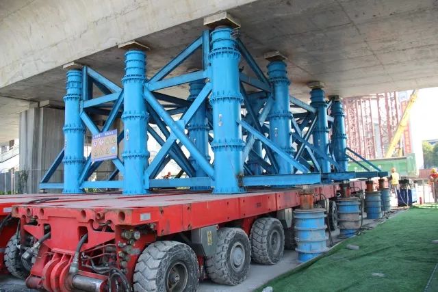 驮起这个庞然大物的,是中国宝武自主研发的自行式模块车(SPMT),它有个响亮的名号——“变形金刚”,它能根据实际工况的不同,选择不同模块,组合成各种吨位和形式的运输车,不需要吊机或任何其它起重设备。在施工过程中,没有高噪音破除、没有高浓度粉尘污染,绿色、低碳、环保、节能,保证了施工期间城区交通快速通畅。此次采用多台4轴线模块车和6轴线模块车,组拼132轴线四台模块车,由一个人独自操控,完成驮运。