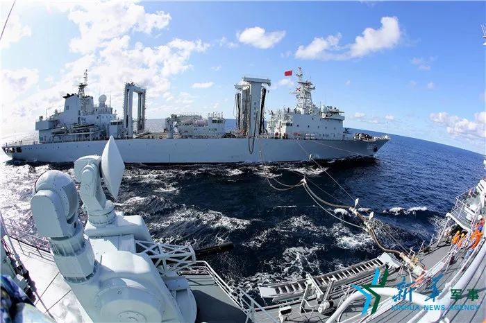 ▲资料图:中俄“海上联合—2017”军事演习中方参演兵力在日本海展开训练。图为舰艇进行横向补给。