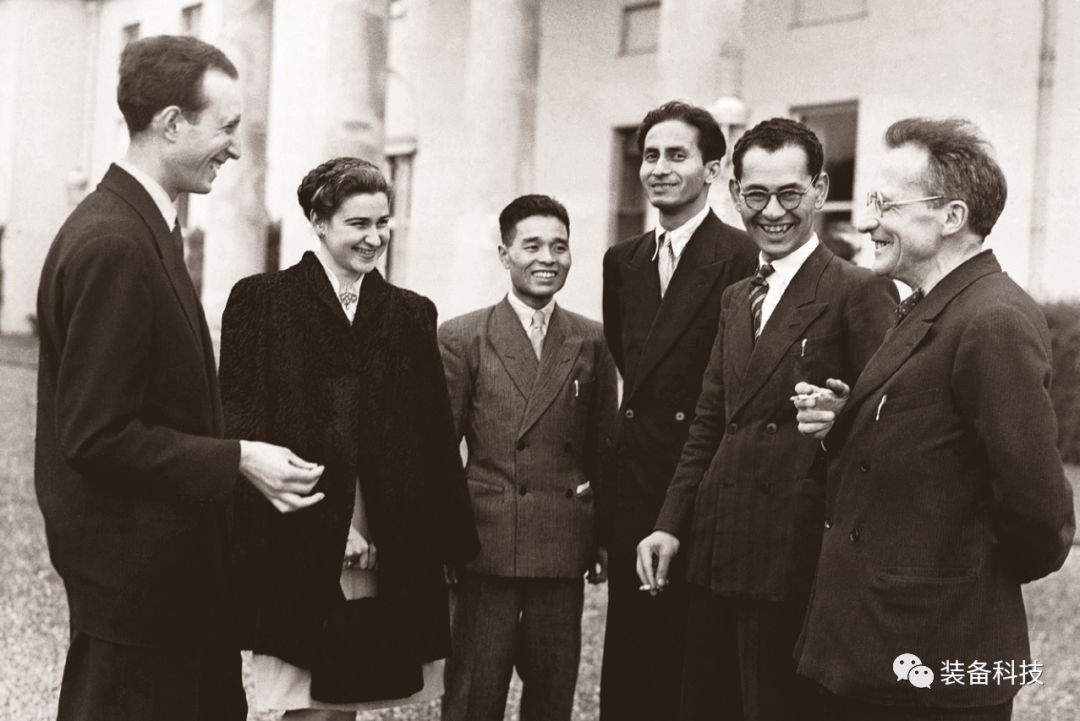 1947 年,程开甲(左三)与国际学术会议代表进行交流。
