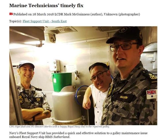 另外,耿直哥还在一个澳大利亚海军的官方网站上查到这样一个信息:“萨瑟兰”号在大概3月28日左右遭到恶劣天气袭击,导致其厨房的甲板受损,而澳大利亚海军则及时在为其提供了修理。