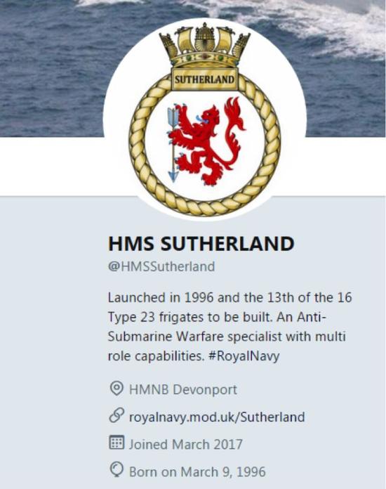原来,这艘“萨瑟兰”号护卫舰在境外社交媒体“推特”上有一个自己的官方账号,名为@HMSSutherland,并且这个账号在3月15日到3月27日之间一直都在更新自己的信息。
