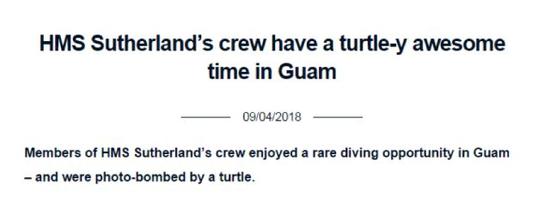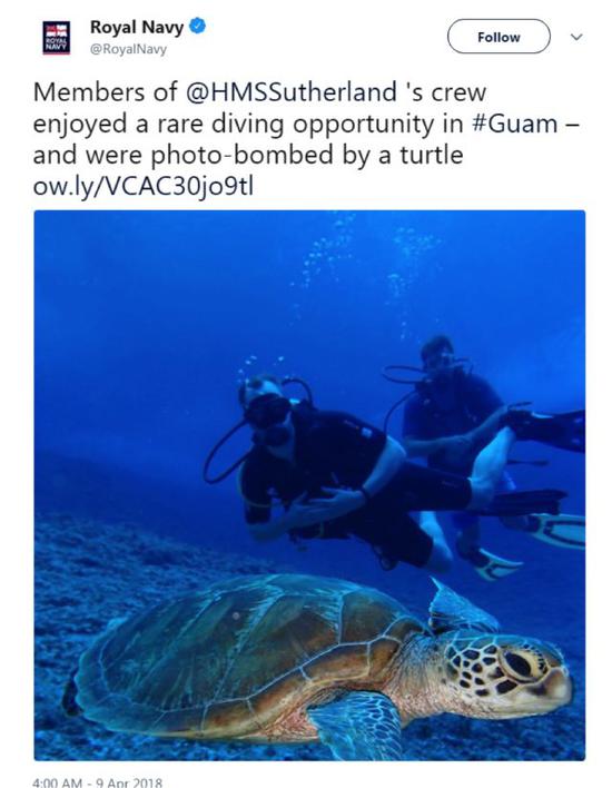 而在这之后,英国皇家海军的官方推特账号显示,这艘护卫舰于4月初抵达了美国的关岛,并在当地进行了非常愉快的潜水活动,还围着海龟各种拍照…。。
