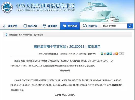 中华人民共和国海事局网站4月12日以中英文发布题为“福建海事局中英文航警(20180011)军事演习”的消息,全文如下: