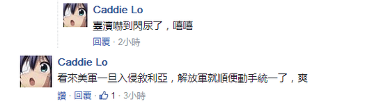 对此,有网友说:“前两天有个鬼在叫反攻大陆的嘛,当兵就是金钱,美女权力,共军不行,快点反攻大陆。”近日,台湾“田园军事学家”游升勋在台湾一档名叫《郑知道了》的节目中说,男人当兵为什么,“抢钱,抢粮,抢女人,你贪官都扫掉了,我当这个兵干什么”。还有网友表示,“看来美军一旦入侵叙利亚,解放軍就顺便动手统一了,爽。”