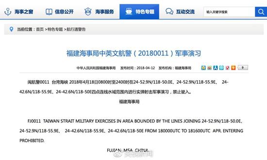 12日,福建海事局发布航行警告:2018年4月18日8时至24时将在台湾海峡相关水域进行实弹射击军事演习,禁止驶入。消息一出,引发各界广泛关注。