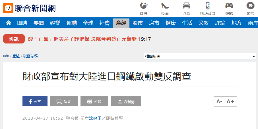“联合新闻网”称,是因美国和欧盟都针对进口钢铁产品展开了关税或者调查。这一举措是为了避免大陆的过剩钢铁产品“低价出口至台湾,而使台湾产业遭致损害”。