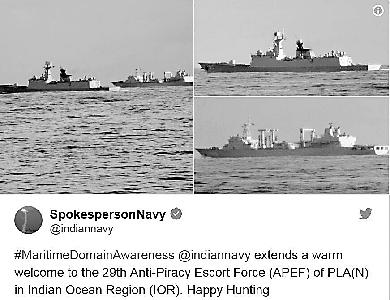 4月4日,由滨州舰、徐州舰、千岛湖舰组成的中国海军第29批护航编队起航,赴亚丁湾、索马里海域执行护航任务。航行途中进入印度洋。17日,印度海军在社交媒体推特上发文:“印度海军热烈欢迎中国第29批护航编队来到印度洋。航行愉快!”推特还附上了拍摄的中国军舰照片。紧接着,印度海军又发了一条推特:“从波斯湾到马六甲海峡,从北部的孟加拉湾到南部的印度洋再到东非海岸,印度海军50艘舰艇每天24小时全天候守卫,任何时间,任何地点”。推特配上了标注印度海军部署的印度洋地图。