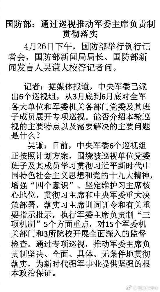 【国防部:通过巡视推动军委主席负责制贯彻落实】