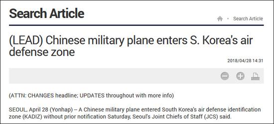 [观察者网 综合报道]据韩联社4月28日报道,韩国联合参谋本部当天表示,28日上午,一架中国军机进入韩国“防空识别区”后,从浦项东南侧向郁陵岛方向飞行后离开。