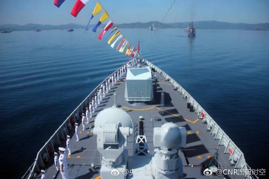 当地时间5月5日,参加“科摩多-2018”多国联合演习的中国海军舰艇编队,在印度尼西亚龙目岛附近海域指定锚地,与多国海军舰艇一道,参加了由印尼海军组织的国际海上阅舰式。上午10时许,来自34个国家的50艘舰艇按国际礼仪悬挂满旗在锚地接受检阅,中国海军导弹驱逐舰长沙舰、导弹护卫舰柳州舰代表中国海军参加阅舰式。海面上战舰林立,各国海军舰艇按照计划,组成4列纵队,参演官兵着装整齐位于各自甲板上分区列队。空中战鹰轰鸣,来自中国、法国、英国、印尼等国家的舰载直升机组成3个飞行梯队和多国海军联合组成的4个固定翼飞行梯队,整齐通过编队上空接受检阅。