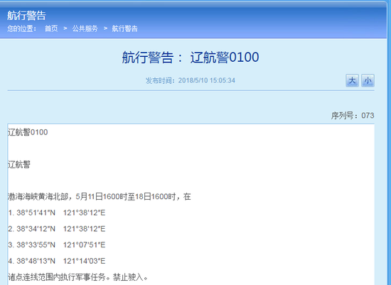 军事:辽宁海事局称渤海海峡黄海北部11至18日有军事任务