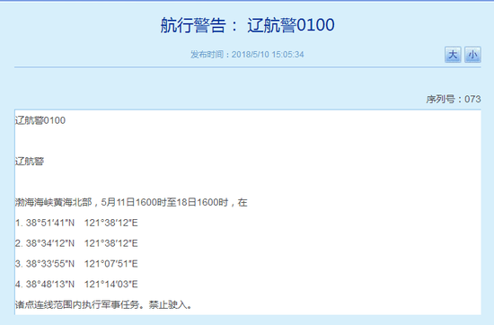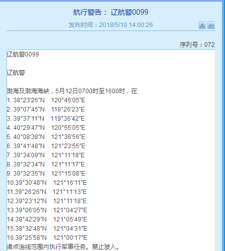 [环球网综合报道]辽宁海事局网站5月10日发布辽航警0099和辽航警0100两条航行警告称,5月11日至18日渤海及渤海海峡、渤海海峡黄海北部将执行军事任务。具体海事信息如下: