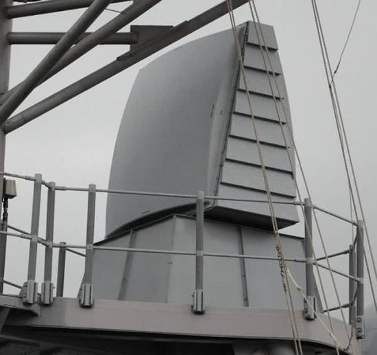 最终几经“缩水”,最后决定在“伯克3”上安装SPQ-9B型X波段雷达充数,图为在“提康德罗加”级巡洋舰上试验的SPQ-9B雷达。与原计划可以用于反导的AMDR-X相比,该型雷达只能精确追踪近距离目标