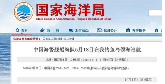 国家海洋局网站5月18日消息,2018年5月18日,中国海警2307、2401、2101、33115舰船编队在我钓鱼岛领海内巡航。