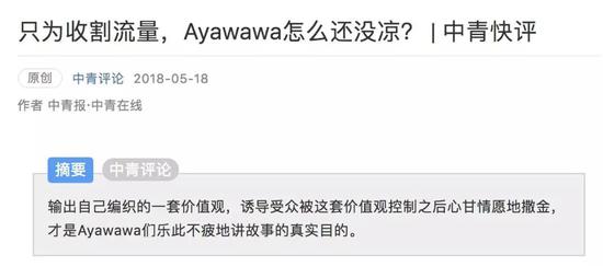 中国青年报评论部公众号@中青评论 发文“只为收割流量,Ayawawa怎么还没凉?”