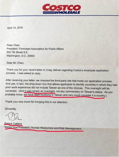 从致歉信内容看,该副总裁的“台独”基调一目了然。他首先承认,“国家”列表中没有台湾这一选项纯属“疏忽”,将尽快修正。他还专门再次强调,这只是一个疏忽,不是有意置评台湾的地位,并声称“开市客在台湾有家分店,非常认同台湾是一个‘国家’”。