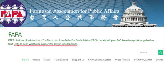 FAPA是一个“台独”非盈利组织,总部位于美国华盛顿。其官网首页显示,该组织的第一项诉求就是:为台湾“独立”寻求国际支持。该组织的宗旨是:维护和增强美国和台湾地区之间的关系,提升美国和台湾地区在东亚地区的安全。在特朗普推进、通过“台湾旅游法案”过程中,该组织是最主要推手之一。