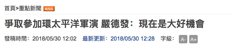 美方近日以干涉中国建设南海为由发难,撤回了对中方的“2018环太军演”的邀请。然而,台湾方面却将美国此举看作是自己参加“环太”的机会。对此,台当局防务部门负责人严德发今天(30日)在“立法院”答询时称,台当局一直都有向美方争取参加环太平洋军演,不是因为美国今年撤回对大陆的邀请才提出。他并声称,“现在是大好机会”,但还是要看美方态度。