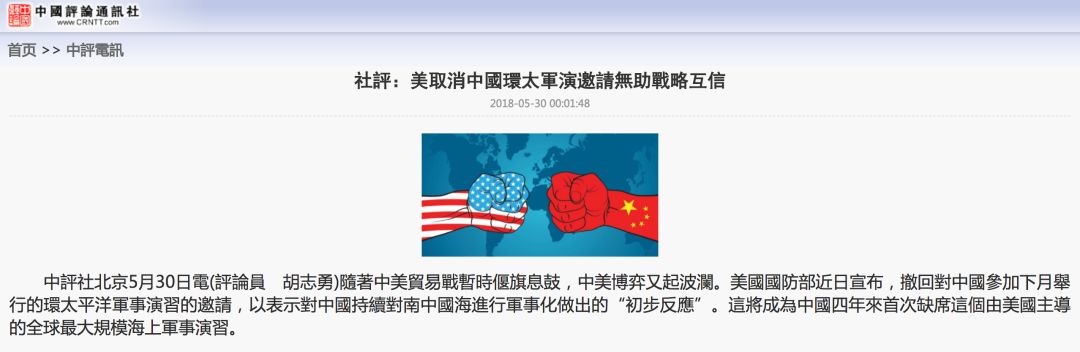 香港中评社30日对此发表题为“美取消中国环太军演邀请无助战略互信”的社评,文章称,中国在南中国海“自己的岛礁上”进行基础设施建设,是国际法赋予主权国家的自保权与自卫权,与军事化无关。美国不应以此为借口取消邀请中国参加两年一次的环太军事演习,此举是冷战“零和”思维在作怪,美国单方面的决定无助于增进中美相互理解与战略互信,可能在美中谈判化解贸易战之际又会使脆弱的中美关系进一步紧张化。而发展健康稳定的中、美两军关系符合双方共同利益,需要双方共同努力加以维护,中、美两国完全可以就海上安全问题开展合作,建立战略互信。