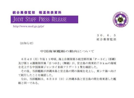 军事:日本军机深夜跟踪中国054A护卫舰穿越宫古海峡(图)