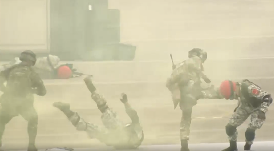 演练的反攻阶段,防御军的黑鹰直升机将反击部队运抵战场后,反击的蓝军部队以整齐的队形,漫步走到距离红军不足十米的平地上展开卧倒,并以密集火力发起突击,并冲锋进行近战格斗,在用火力消灭部分红军士兵后,将剩余的红军士兵准确击倒在地面铺设的防护垫上。最后,突击的蓝军士兵们爬上集装箱顶部,合力将一位原本放在地上的布质红军士兵扔向地面,标志着演习过程达到了高潮。