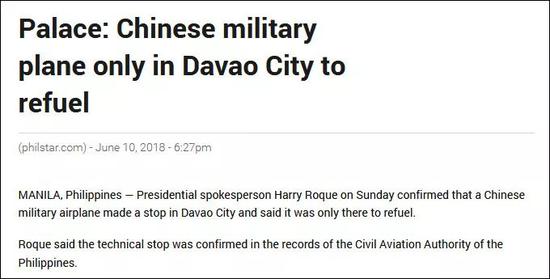 菲总统府发言人洛克10日表示,中国军机在前往澳大利亚途中,短暂停靠达沃机场加油,得到了菲政府批准,没有任何问题。停靠过程中,中国军方人员没有走出机场。