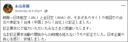 当时他呼吁台民众一起要求日本航空公司把“中国台湾”再改回“台湾”。随后他又发文表示,不到24小时,日航、全日空便将原先标注台湾后方的中国撤除,继续将“台湾”列为“国家”,他“感受到了日本企业的良知”,不仅松了一口气,也感到宽慰,更感谢参与正名请愿运动的每个人。