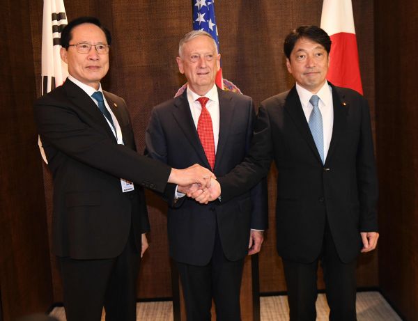 3日,美国防长马蒂斯(中)、韩国国防部长官宋永武(左)和日本防卫相小野寺五典在香格里拉对话会间隙举行三边会谈。(法新社)