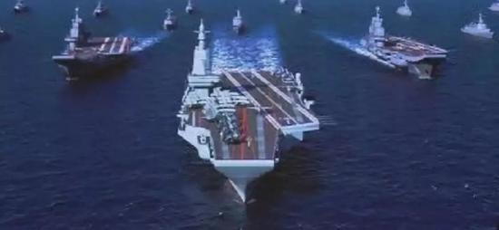 6月20日),中国船舶重工集团公司微信公号“中船重工”在发布一则会议消息时,配发的一张会议图背景为3艘航母领衔的庞大编队。