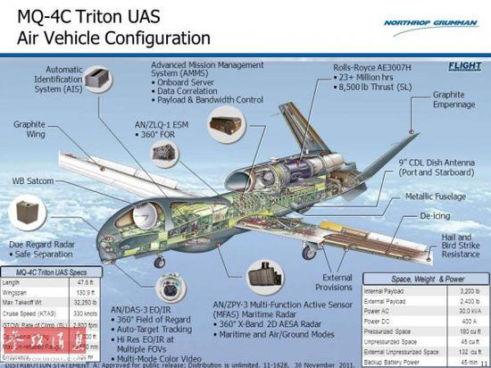 美国《国家利益》网站发表的题为《海军航母-巧妙设计可摧毁更多敌舰》的文章称,MQ-4C“人鱼海神”(下文简称MQ-4C)的设计目标就是充当海军版的“全球鹰”(美空军编号RQ-4,于2001年投入服役,已参加过多次实战)高空长航时无人侦察机。MQ-4C与“全球鹰”一样,均由美国著名军火巨头诺斯罗普·格鲁曼公司研发,与“全球鹰”相比,MQ-4C的作战性能可谓是全面提升,该型机全长14.5米,翼展39.9米(与波音737客机的翼展相当),机高4.7米,全重14.6吨,巡航速度每小时610千米,最大航程增至1.5万千米(“全球鹰”为1.4万千米),续航时间增至30小时(“全球鹰”为28小时)。