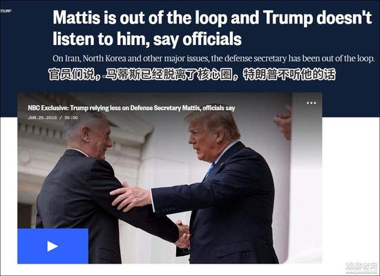 NBC表示,在现任和前任白宫以及国防官员的描述中,特朗普最近这些重大国家安全问题的决定,都突显出近几个月来,马蒂斯的角色变化:他似乎正逐渐被排出特朗普的核心决策圈。