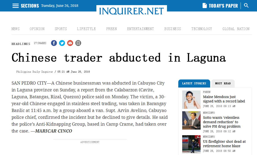 ? 原标题:《菲媒称中国商人在菲律宾遭绑架 我使馆:正在核实信息》