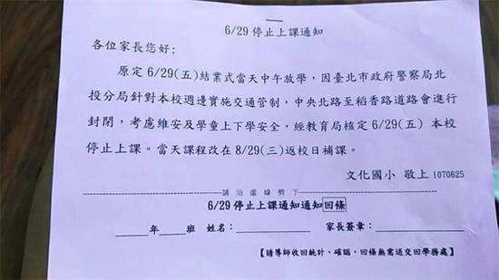 据台湾“中时电子报”6月26日报道,由于蔡英文路过,使得附近学校被迫停课,引起家长怒批,“好大的官威”、“衍生的安亲费用,是要由总统府补贴吗?”根据家长提供的停课通知单,原定6月29日当天结业式,因台北市警察局北投分局将针对文化小学周边实施交通管制,届时中央北路至稻香路道路封闭,考虑维安及学童上下学安全,经教育局核定当天停课,改在8月29日补课。
