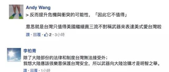 此外,《环球时报》记者注意到,在该条新闻下方,台湾网友一致表达了对台当局被美国作为“棋子”的不满,有网友表示,当特朗普要求每一个同盟交保护费时,当中美贸易大战开打时,台湾能帮美国做什么?只能当个出钱的盘子,“除了这个?台湾还有利用的价值吗?”还有网友表示:“大陆应该很乐意保护台湾安全,所以武器向大陆洽购才是明智之举。”