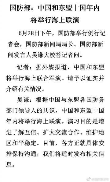 军事:我国防部称中国和东盟十国年内将举行海上联演
