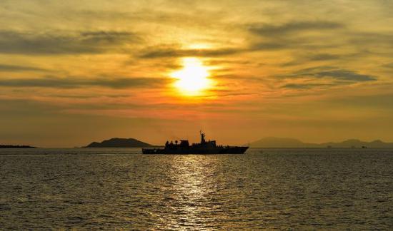资料图:驶离码头的海警3304舰航行在夕阳中。新华社记者 毛思倩 摄