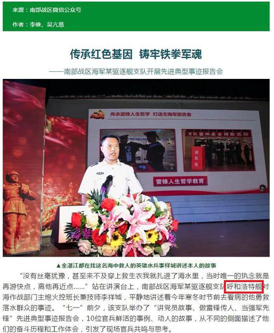 南部战区微信公众号6月30日发布的《传承红色基因 铸牢铁拳军魂——南部战区海军某驱逐舰支队开展先进典型事迹报告会》一文提到,“‘没有丝毫犹豫,甚至来不及穿上救生衣我就扎进了海水里,当时唯一的执念就是再游快点,离他再近点……’站在讲演台上,南部战区海军某驱逐舰支队呼和浩特舰对海作战部门主炮火控班长兼技师李祥城,平静地讲述着今年寒冬时节前去看病的他勇救落水群众的事迹。‘七一’前夕,该支队举办了‘讲党员故事、做雷锋传人、当强军先锋’先进典型事迹报告会,10位官兵鲜活的事例、动人的故事,从不同的侧面描述了他们的奋斗历程和工作体会,引发了现场官兵共鸣与思考。”