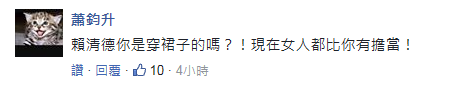 不料此话一出,即遭网友打脸,“天天鞭尸马英九,那选你们上台干嘛,找借口谁都会,下次选头猪好了 !”还有人对赖清德的性别持怀疑态度,“‘赖院长’难道穿的是裙子?话说现在的女人都比你有担当……”“喜欢打太极?那年底就让你们下台!”