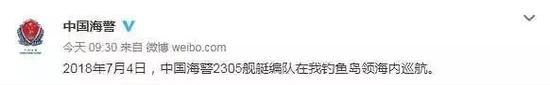 据中国海警局官方微博消息:2018年7月4日,中国海警2305舰艇编队在我钓鱼岛领海内巡航。据悉,这是中国海警局官方微博首度上线并发布消息,此前相关消息是由国家海洋局网站发布。