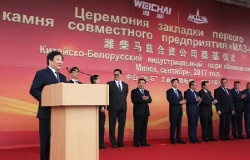2017年9月13日,潍柴集团董事长谭旭光出席潍柴马兹合资公司奠基仪式。(企业供图)