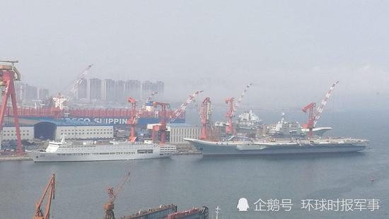 据悉在首艘国产航母转移出船坞之后,正在大连造船厂接受改造的辽宁舰并没有紧随着进入船坞,船坞目前仍是船闸关闭的蓄水状态,而辽宁舰依然处于维护状态,航母舰岛顶端的顶板雷达还处于拆除状态。原本停泊于辽宁舰旁的88号综合保障船则转移到了远处,为国产航母出坞腾出泊位。