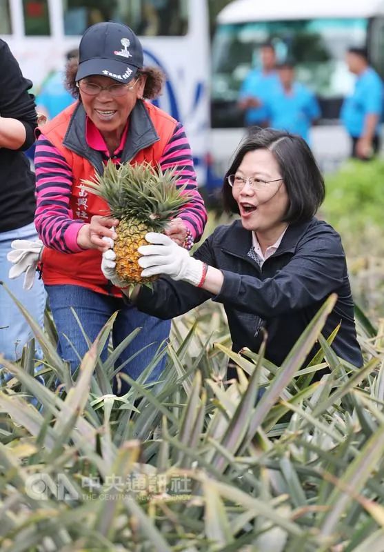 ▲资料图片:2018年3月,蔡英文在富兴社区的凤梨公园,体验摘凤梨的乐趣。(台湾“中央社”)