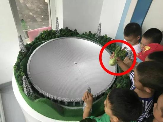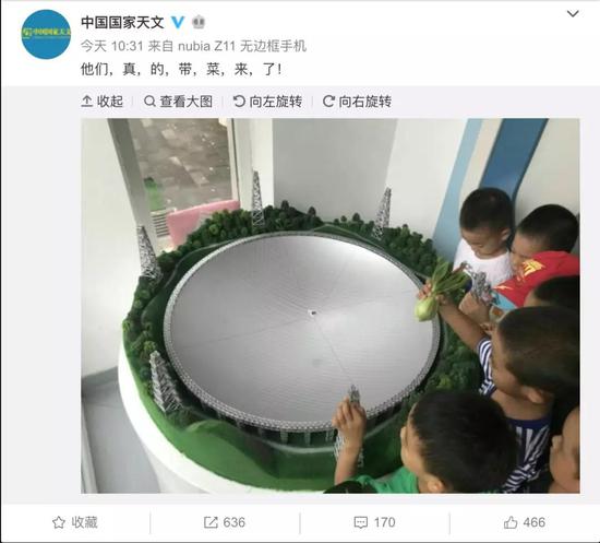 今日上午《中国国家天文》杂志官方微博@中国国家天文 发布了一条图文微博称“他们,真,的,带,菜,来,了! ”,在照片中,一群正在围观FAST模型的小朋友中有一位小“吃货”居然拿出了一颗青菜???