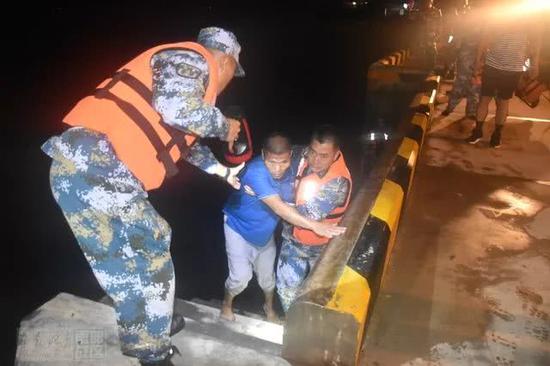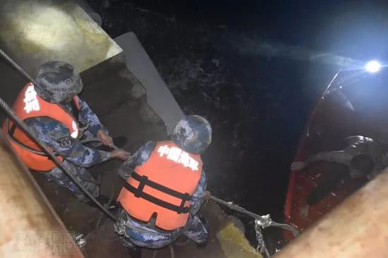 21时14分,救援官兵乘小艇赶赴现场,发现由于风浪过大,渔船已经倾覆沉没。救援官兵紧急搜救,在风浪中救出3名渔民,另有1名渔民落水失踪。