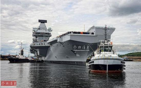 英国“伊丽莎白女王”号航母从位于苏格兰的罗塞斯造船厂港口启航特写图。(图源:参考消息网)